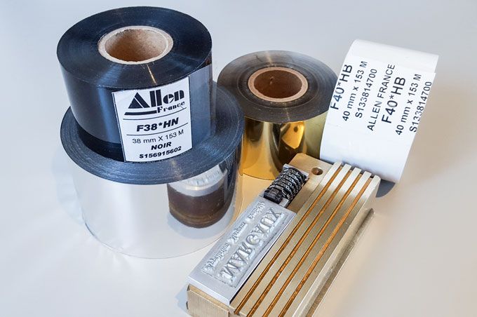 Le principe du marquage à chaud allie un film de transfert haute température à des caractères en laiton ou en acier, permettant une impression de haute qualité sur une variété de supports, du PVC aux étiquettes papiers, vernies et tissées, en passant par le complexe aluminium, les étuis carton, et même les surfaces non planes, comme les surfaces alvéolées.